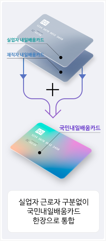 실업, 재직, 자영업 여부에 관계 없이 국미내일배움카드 한 장으로 5년 간 사용 가능합니다.